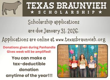 TBAJ Scholarships are awarded to current TBA members on the basis of scholastic excellence in high school and/or college, demonstrated TBA or associated affiliate leadership, interest in the cattle industry, and youth leadership activities. The Texas Braunvieh Association Junior Scholarship Fund requires applicants to be an active paid junior member of the Texas Braunvieh Association for a minimum of 2 out of the last 3 years prior to applying. Applicants must be a senior in High School or freshman (1 st Full-tim e year) in College. In addition, applicants must have participated in at least one speaking event at 1 out of the last 2 State Show’s and achieved at minimum $300 in the sponsorship drive for the 2025 TBA State Show. Sponsorship includes: calendar sales from (Oct. 2024–Jan. 2025) as well as sponsorship monies raised for the Texas Junior State Show held in April, 2025.